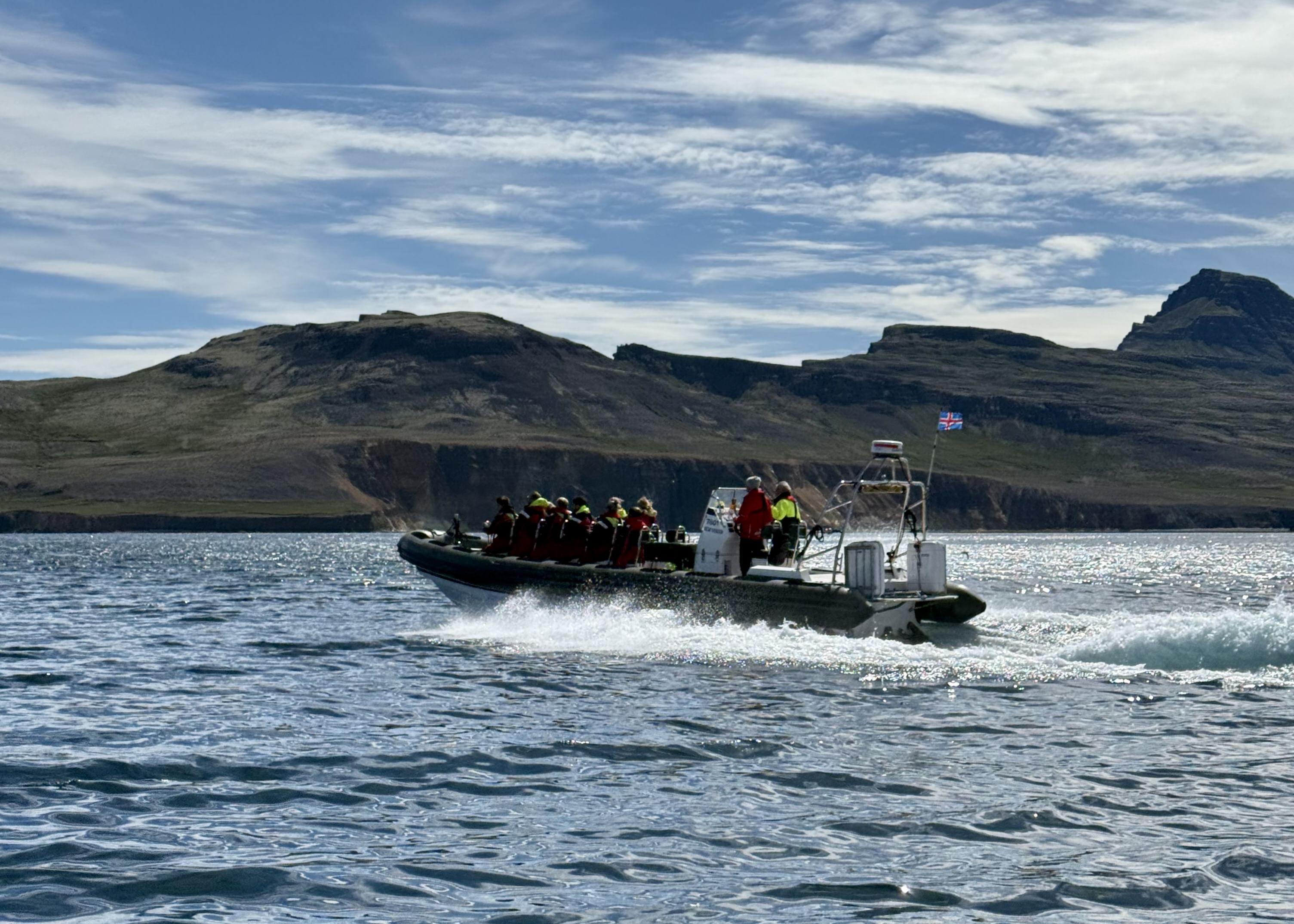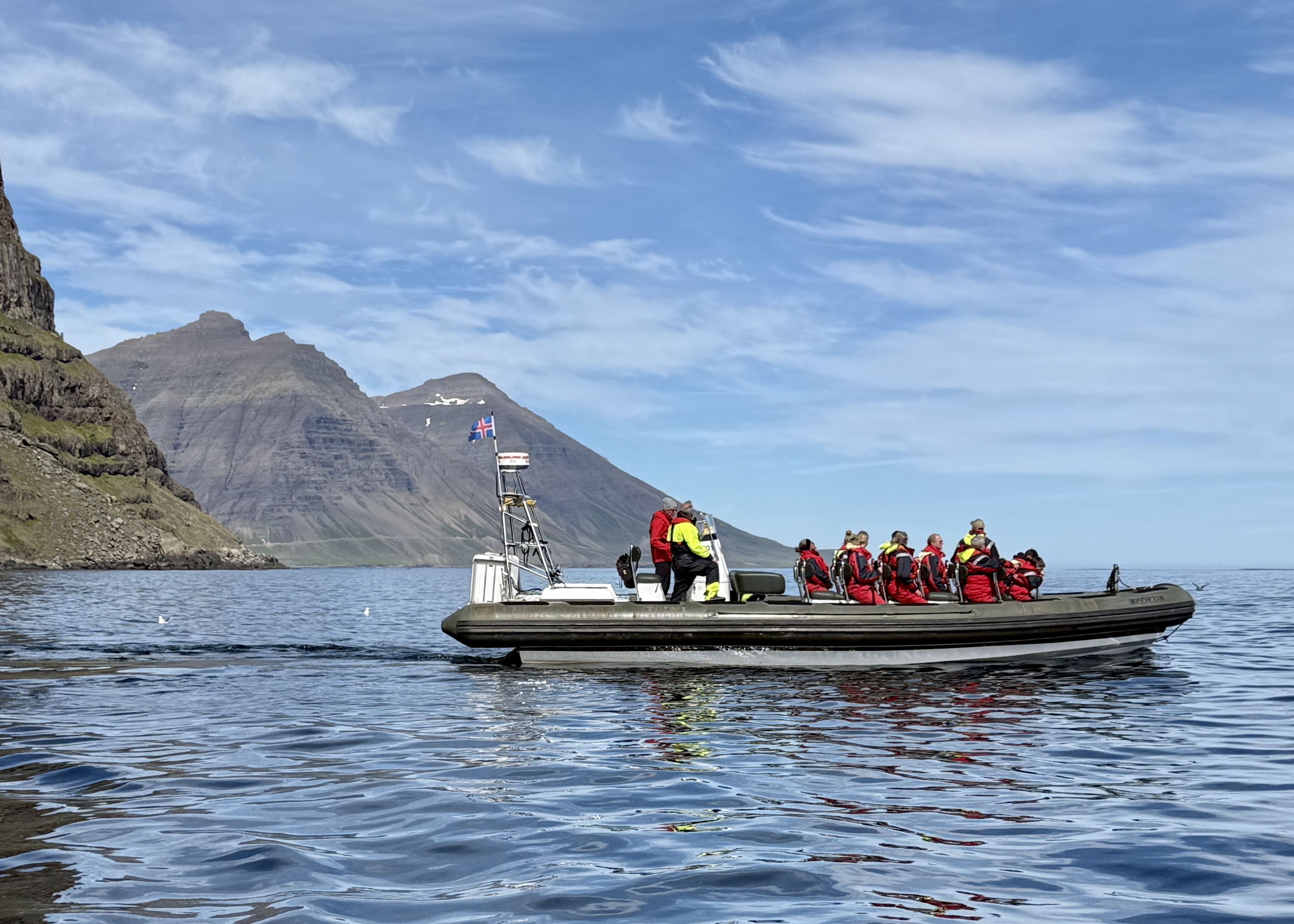 Experience Eastfjords on an exciting RIB boat tour! We cruise through beautiful fjords and visit colorful Rauðubjörg, the majestic cliffs of Nípan, the enchanting Páskahellir cave, and the peaceful Hellisfjörður. A fantastic way to explore nature!