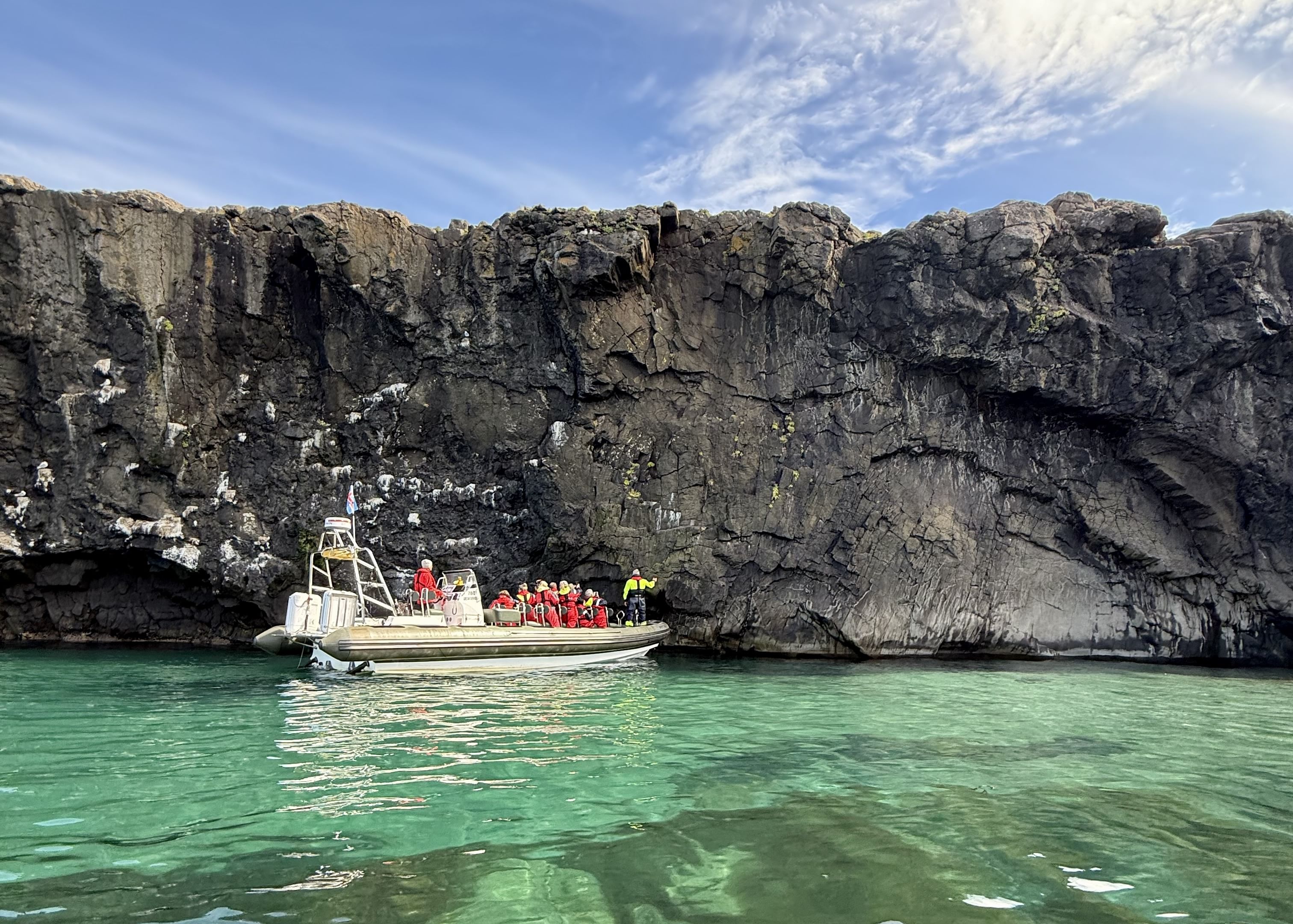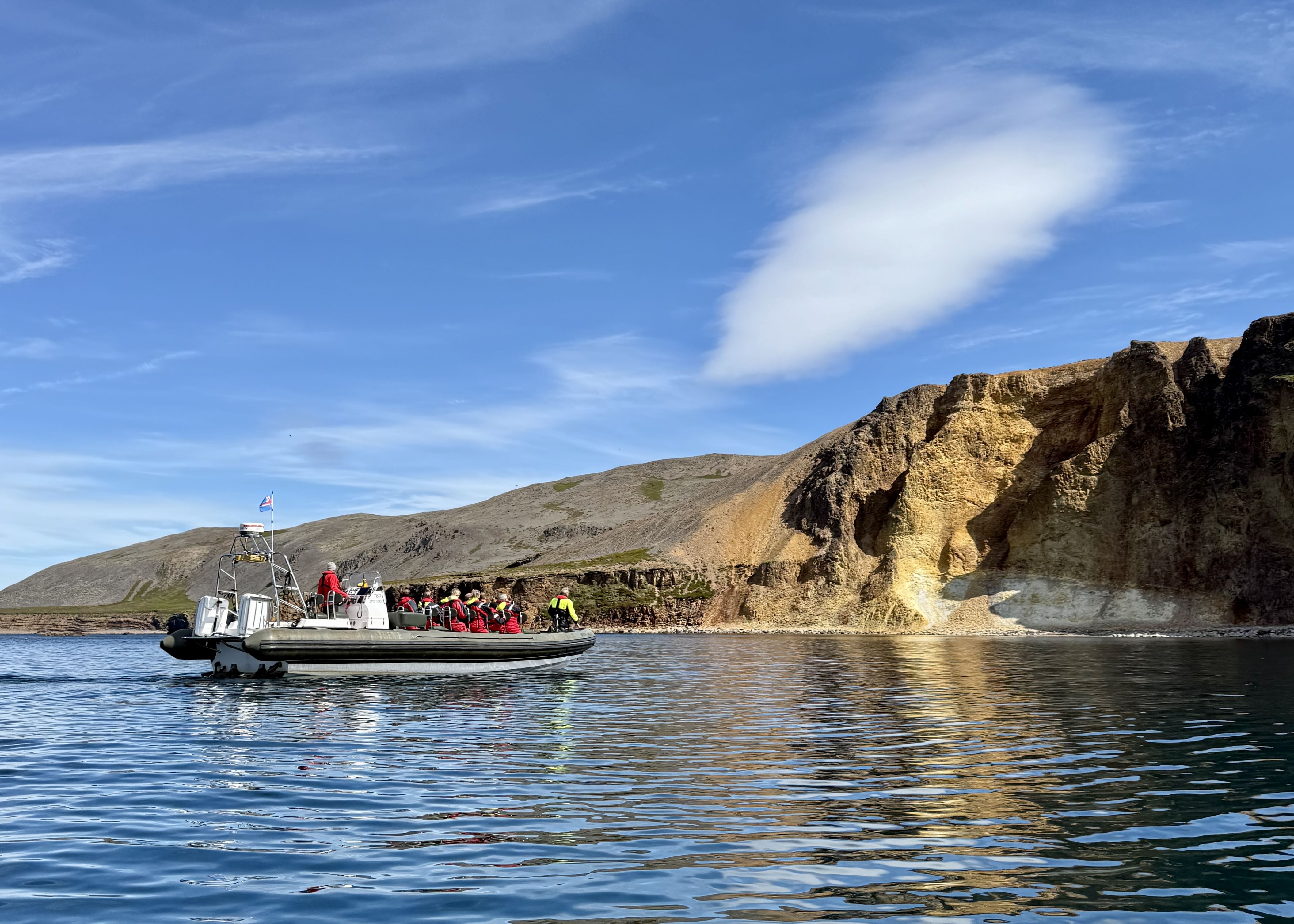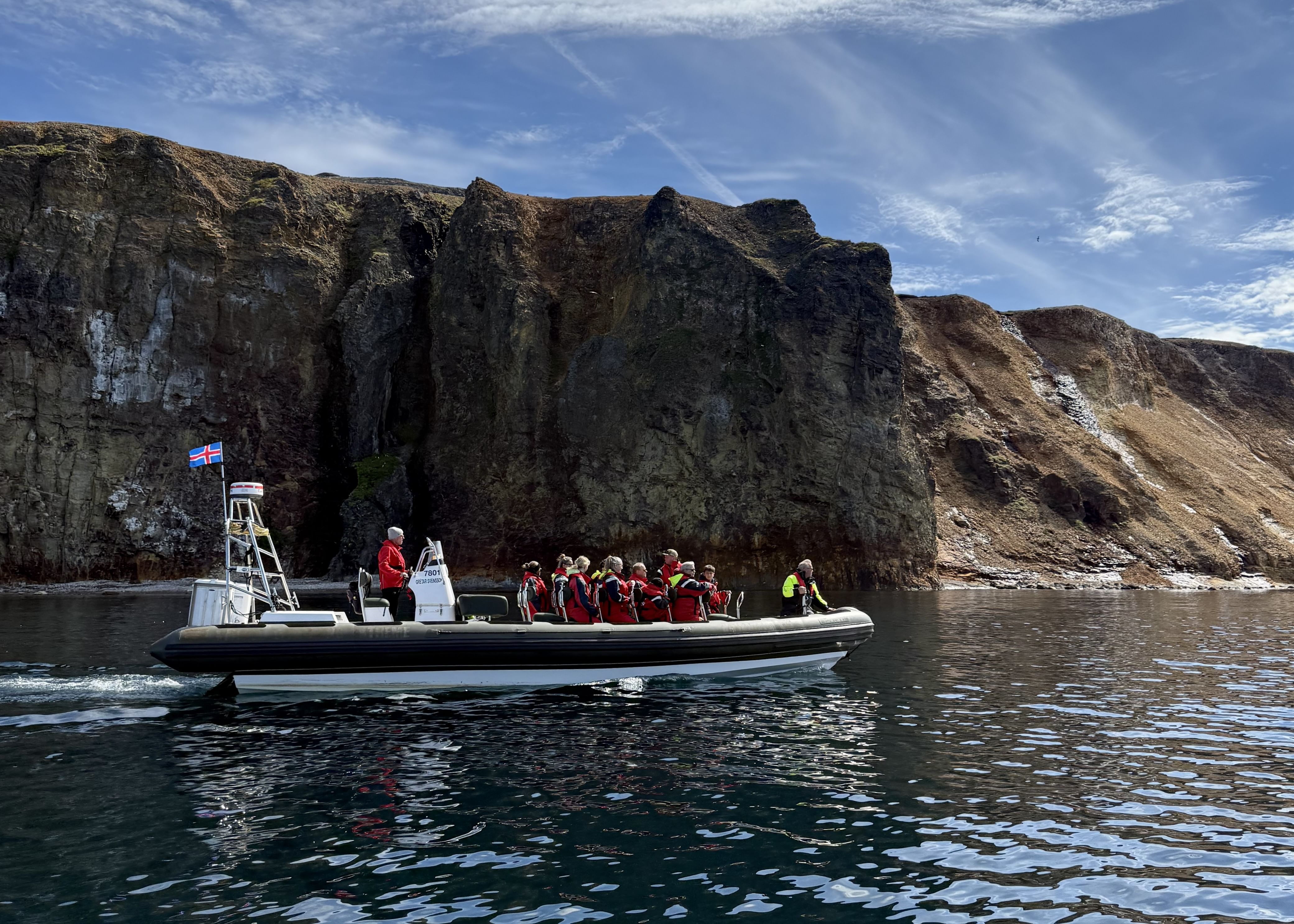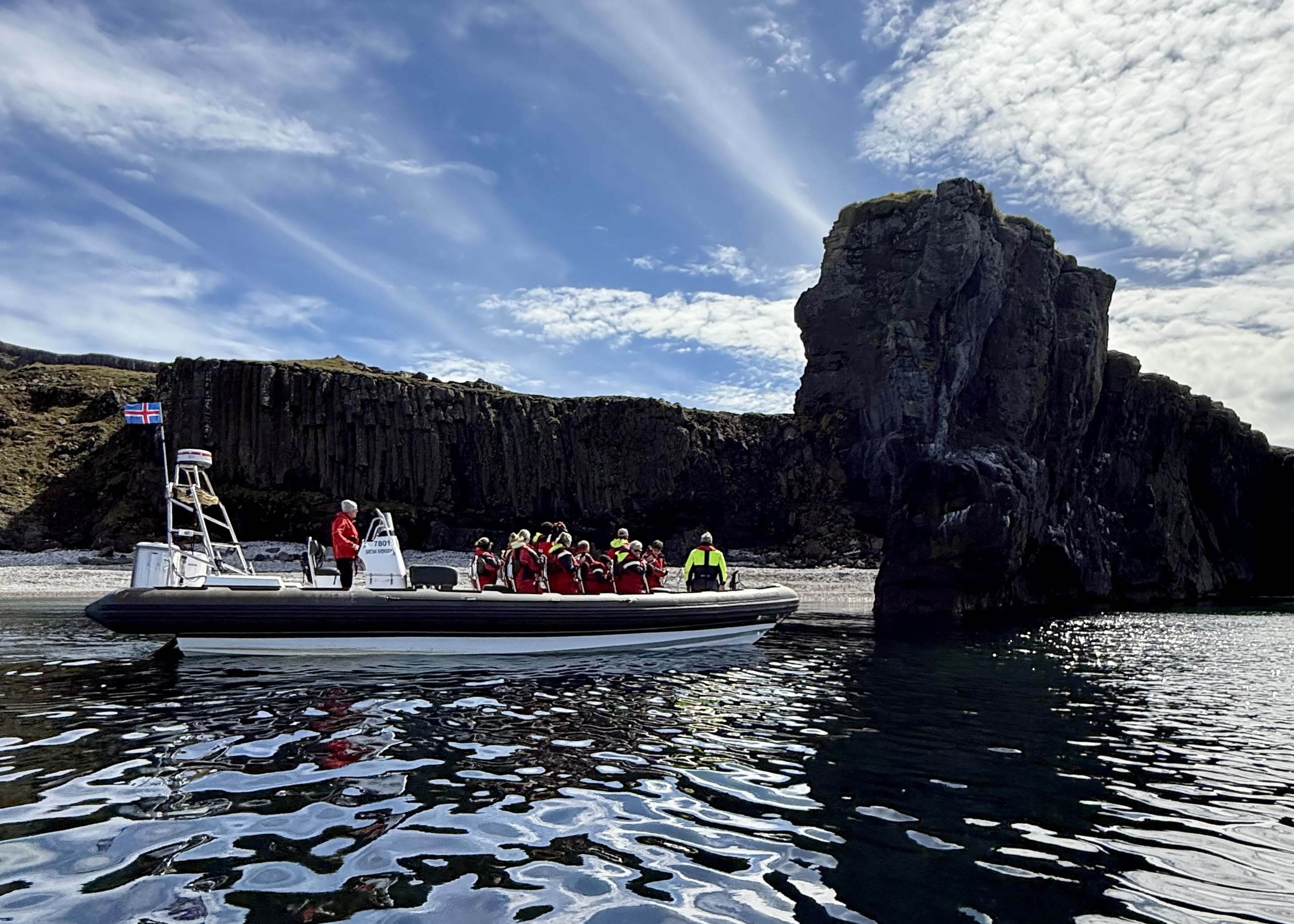 Then comes Rauðubjörg - cliffs so vivid in colour they seem unreal. Reddish rhyolite and elegantly curved basalt columns shimmer in the light, like nature’s own cathedral. We pause offshore to soak it all in, take photos, and simply be present with the land.