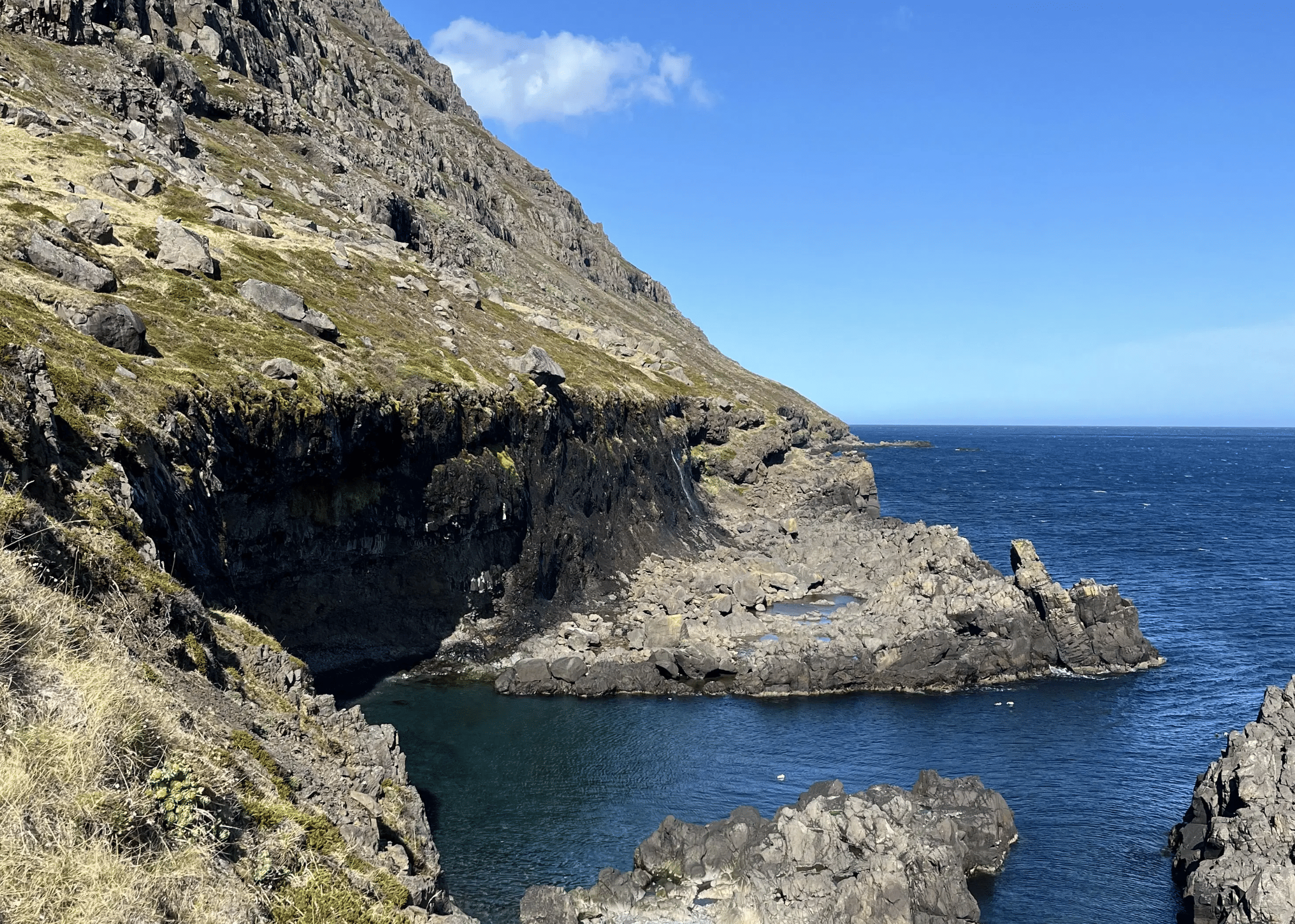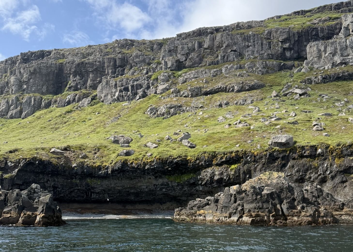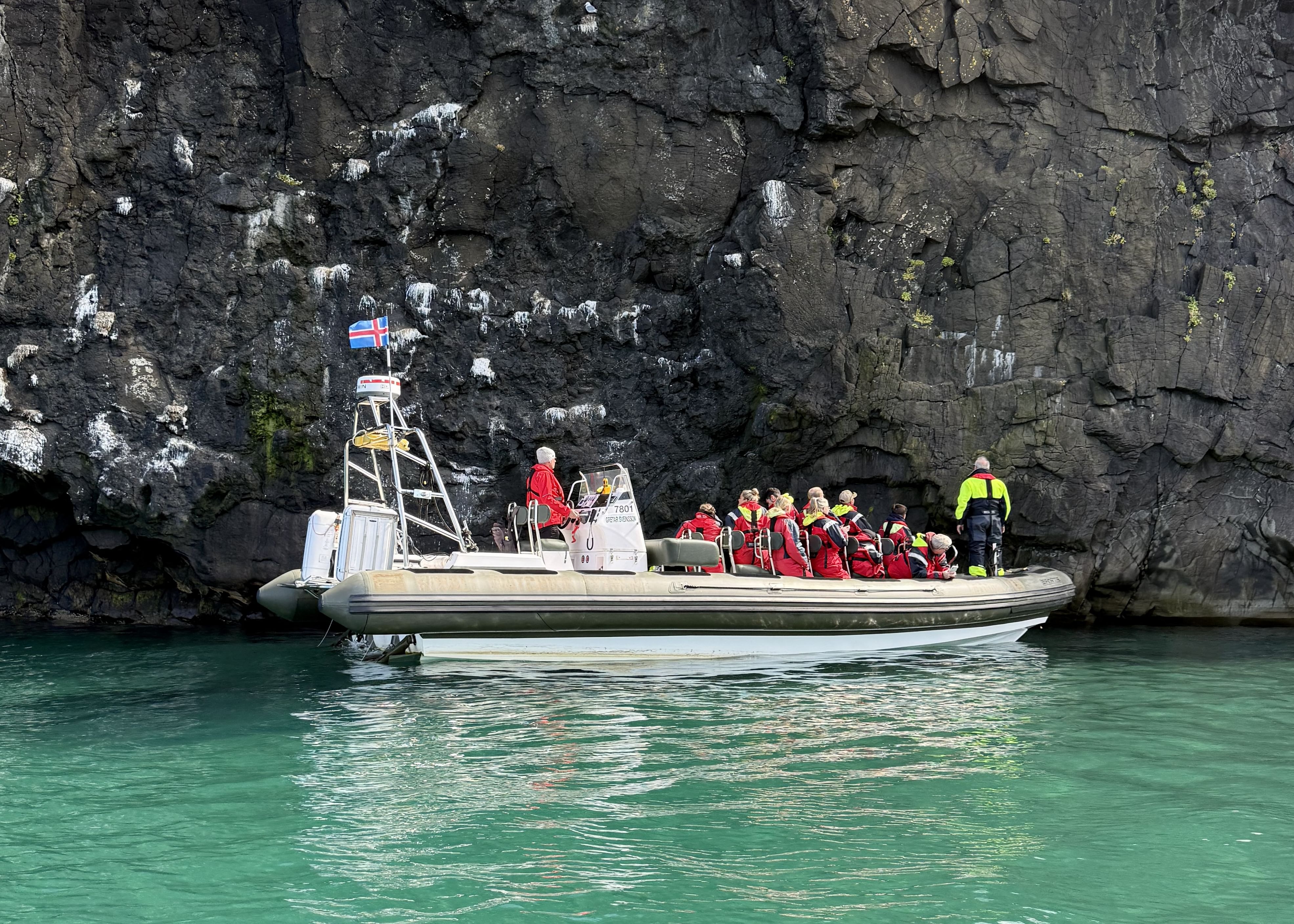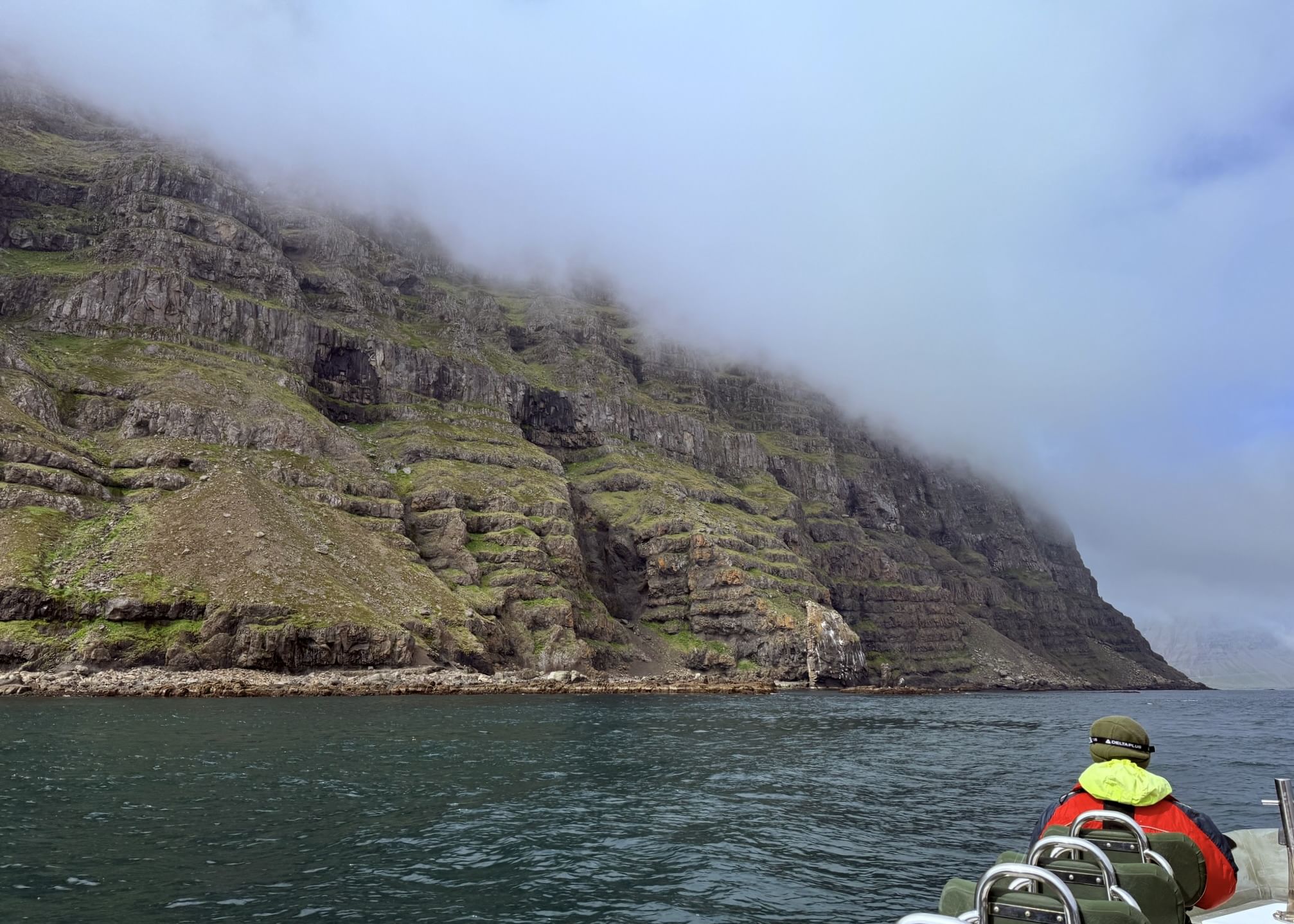 Then comes Rauðubjörg - cliffs so vivid in colour they seem unreal. Reddish rhyolite and elegantly curved basalt columns shimmer in the light, like nature’s own cathedral. We pause offshore to soak it all in, take photos, and simply be present with the land.